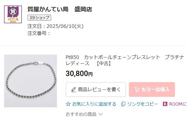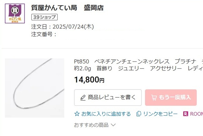 これは7月末に購入したもので、Pt850の2.0gで14,800円でした。