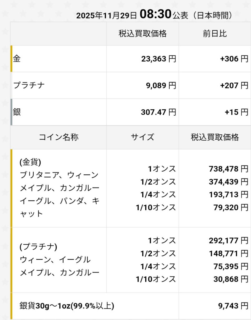 いよいよ1オンスの買取価格が1万円に近づいてきました。