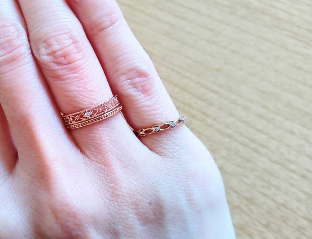 小指につけてもかわいいですが、薬指でもいい感じです。